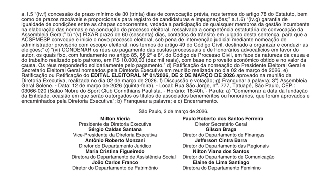 - 13h30 – Primeira convocação para Assembleia de Prestação de Contas 2025