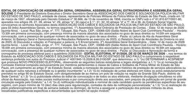 - 14h00 – Segunda convocação e início da Assembleia de Prestação de Contas 2025