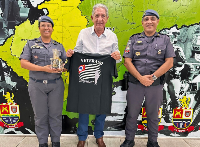 Após uma conversa amigável, o Comandante do CPI/1, Cel PM Luiz Fernando Alves, acompanhado da Ten Cel PM Andréa Marcondes de Albuquerque Figueiredo, entregou um diploma e alguns mimos ao nosso Presidente, incluindo a camisa de Eterno Veterano.